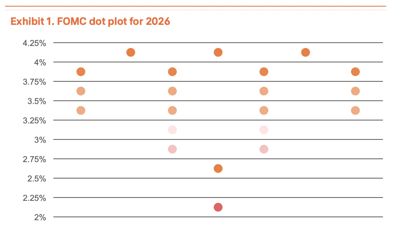 美联储在 2025 年 9 月至 12 月期间连续三次降息,累计降幅 75 个基点,目前利率处于 3.50%—3.75% 区间。12 月点阵图预计 2026 年底利率将降至 3.4%。虽然今年不太可能出现 50 个基点或更大规模的单次降息,但随着鲍威尔任期于 5 月结束,特朗普政府可能会任命一位立场更偏鸽派的继任者,这将确保货币宽松趋势得以延续。