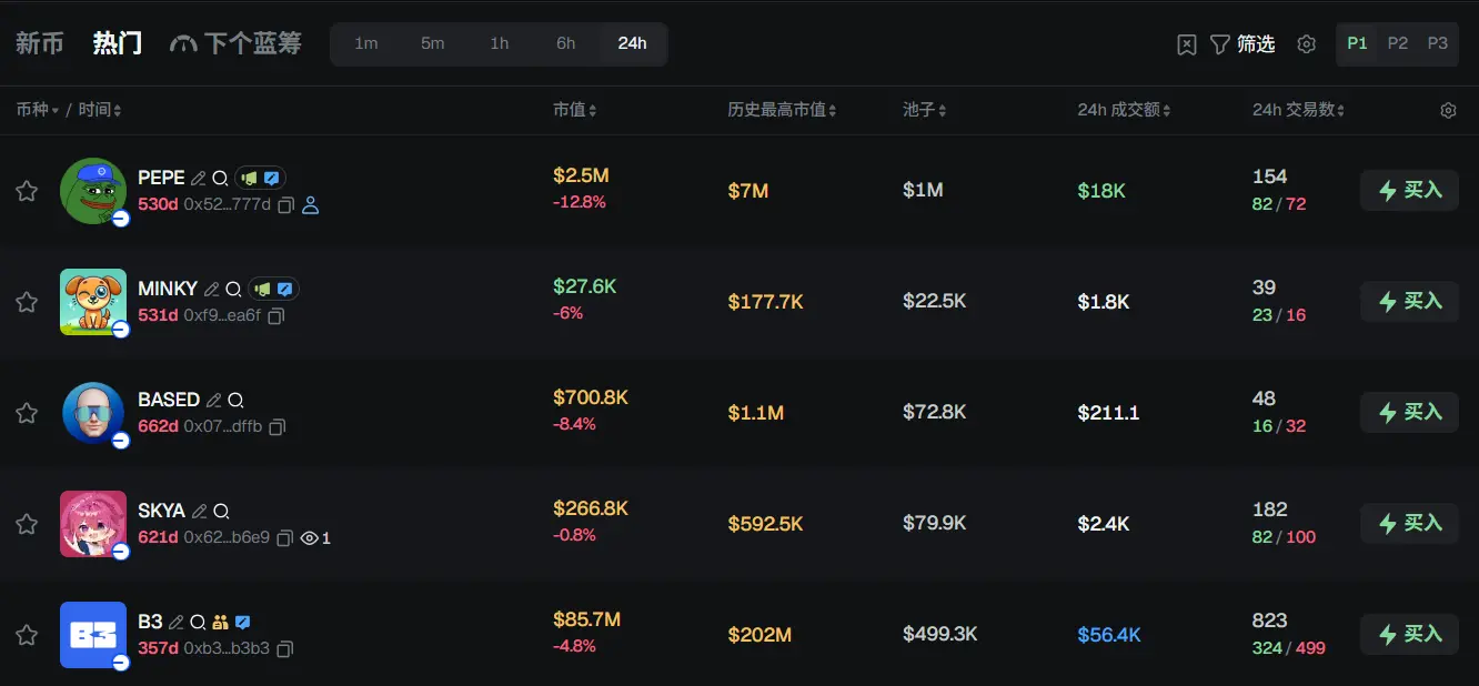 过去 24h Base 热门代币前五依次为:PEPE、MINKY、BASED、SKYA、B3