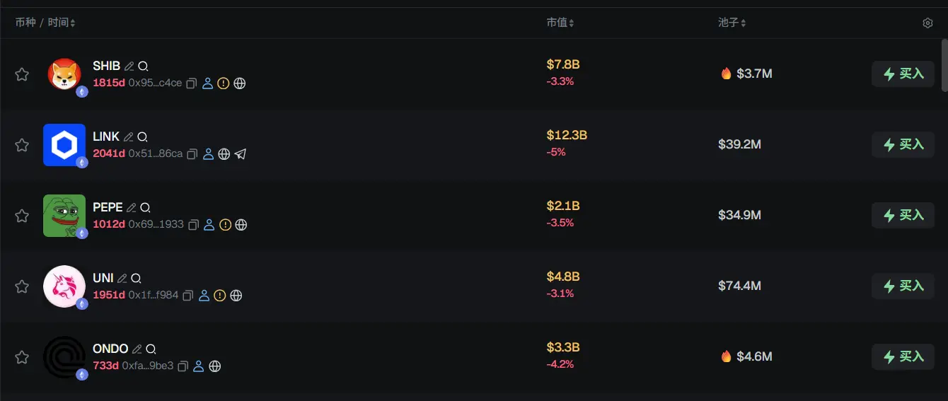 过去 24h ETH 热门代币前五依次为:SHIB、LINK、PEPE、UNI、ONDO