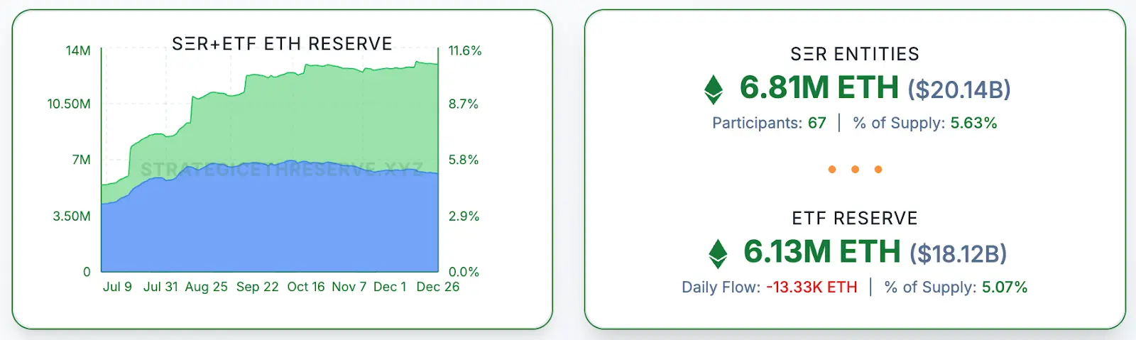 截稿前的数据显示,DAT 与 ETF 共计持有高达 10.7% 的 ETH 流通供应量,前者累计持有 681 万枚 ETH(约 201.4 亿美元),后者则是 613 万枚 ETH(约 181.2 亿美元),这也说明了以太坊的市场供应结构已发生质变,机构化持有正在锚定以太坊的价值下限。