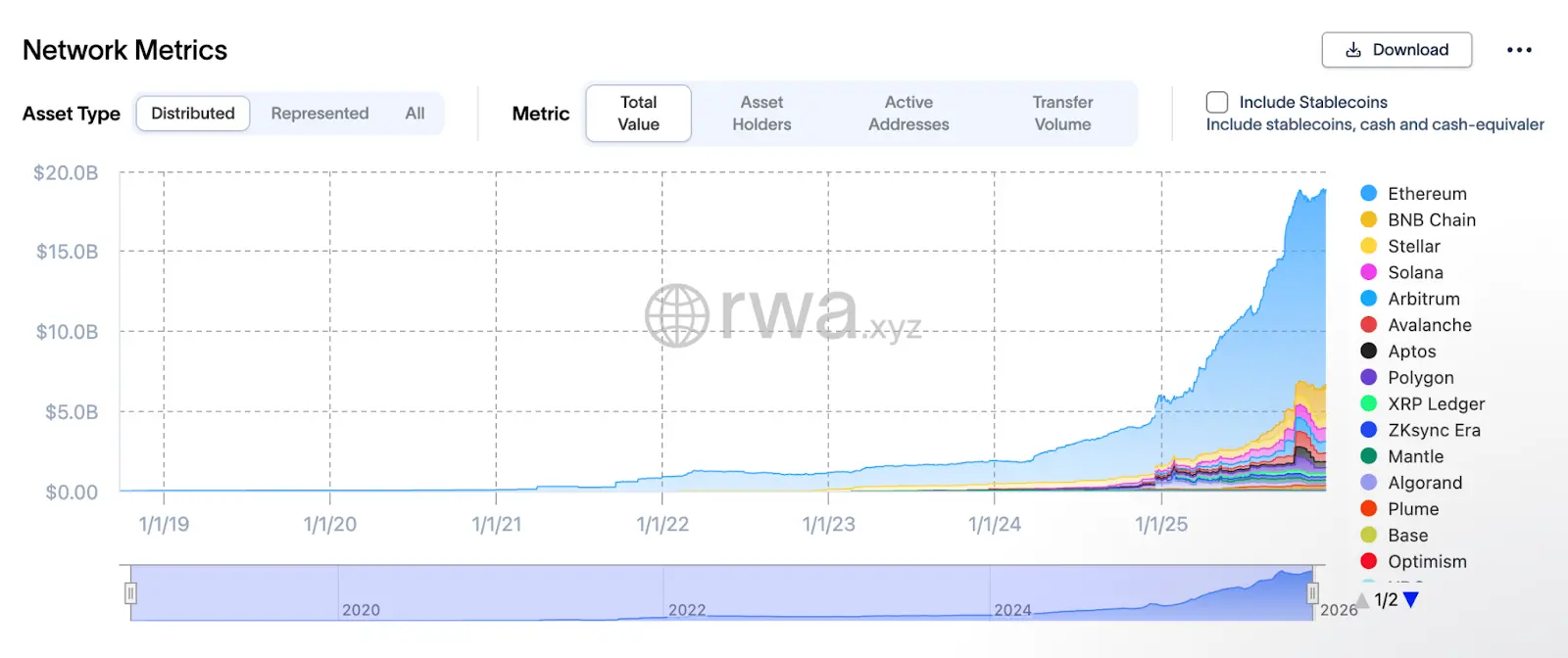 其中,以太坊稳定币的供应量年增45%,从 1,118 亿美元增至 1,625 亿美元。另外,无论是国债代币化还是信贷产品,几乎所有大型金融试点(如摩根大通的首个代币化货币市场基金 MONY 与贝莱德的 BUIDL 基金)都首选以太坊。截至目前,以太坊在 RWA 市场的份额高达65.46%,远超第二名 BNB Chain(9.83%)。