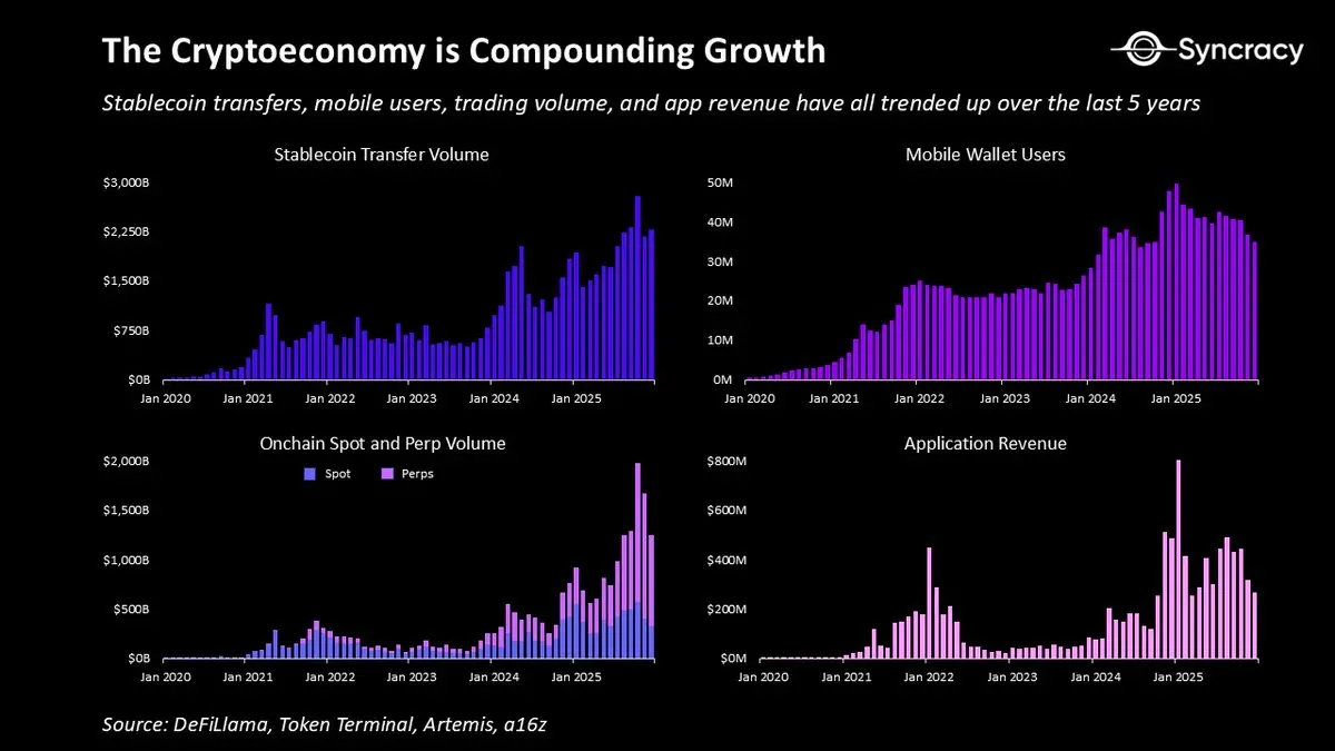 加密经济正处于我入行八年来所见过的最大转型期。机构正在囤积代币,而早期的密码朋克先驱们则在分散配置财富;企业正为 S 型曲线增长布局,而幻想破灭的加密原住民则深感倦怠;各国政府正引导全球金融体系向区块链轨道转型,而日内交易员却还在为K线图上的波动忧心忡忡;新兴市场正欢庆金融民主化,而美国本土的愤世嫉俗者则哀叹这一切不过是一场赌场游戏。