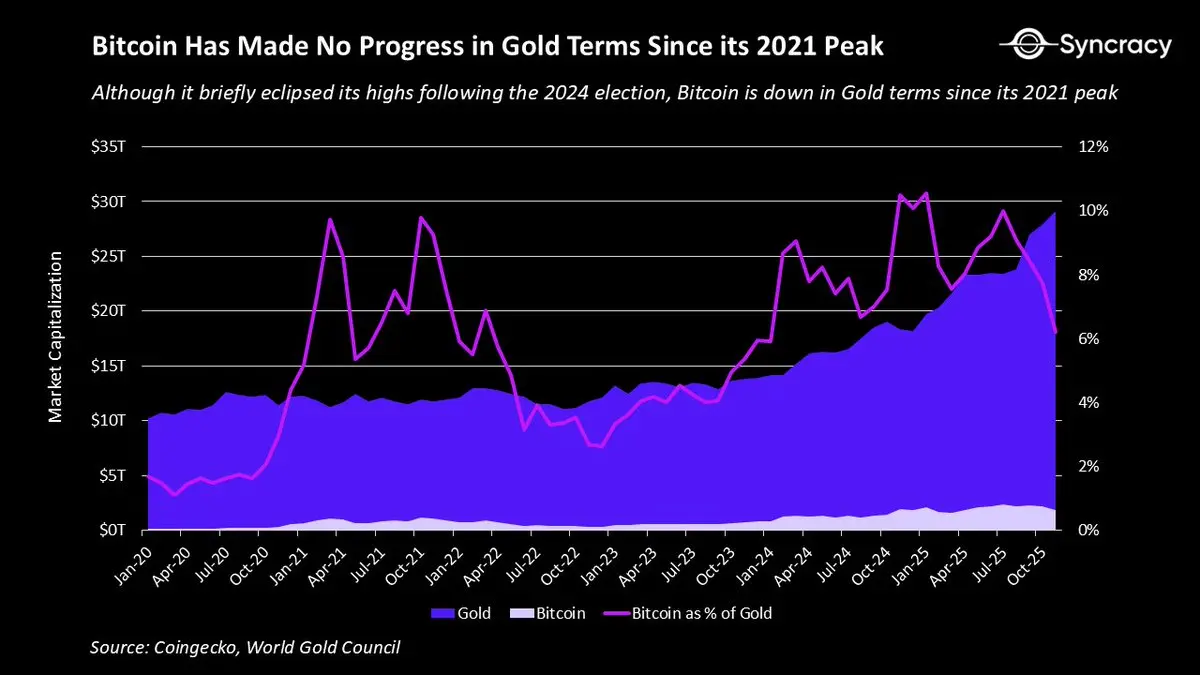 尽管我们取得了诸多进展,但自 2021 年以来,比特币兑黄金价格并未创下新高,实际上不升反降。谁能想到,在特朗普口中的“世界加密之都”,在史上最成功的 ETF 推出之后,在美元被系统性贬值的背景下,比特币作为数字黄金的表现竟不如四年前?