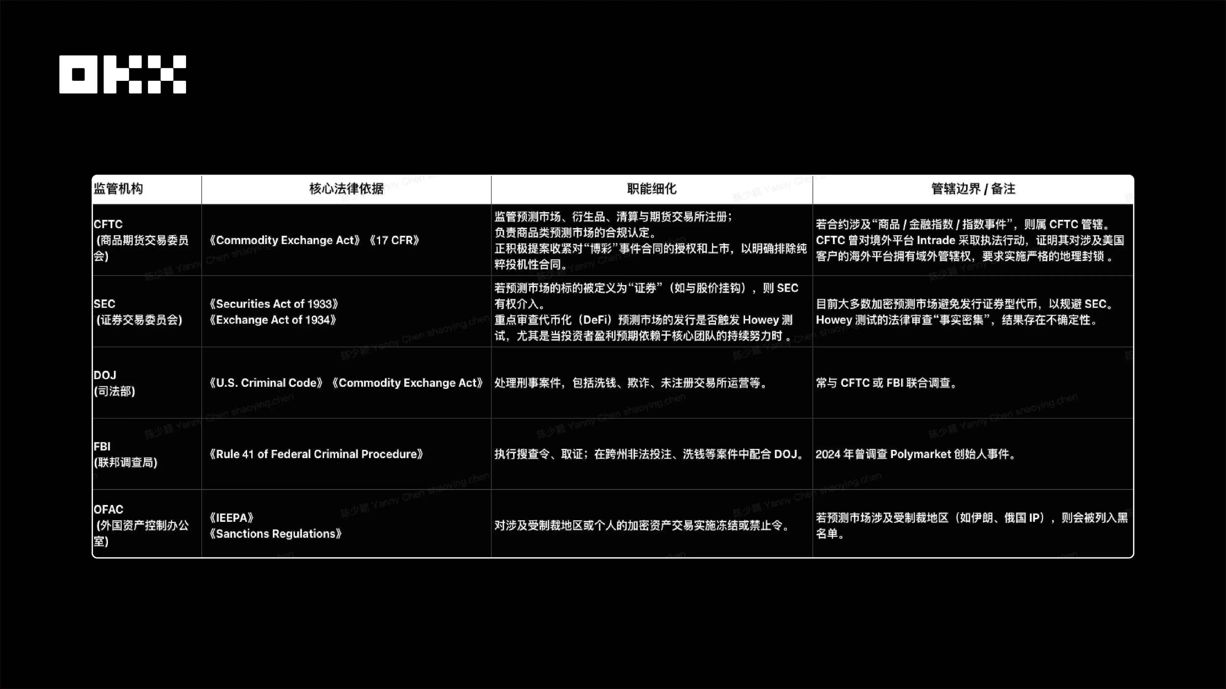 最后,如果被归类为证券,监管机构为联邦层级的 SEC(证券交易委员会),主要针对 DeFi 平台,当平台盈利预期依赖核心团队的持续努力或标的物与股价挂钩时,可能触发 Howey Test,被视为投资合同;现实证据是 SEC 持续重点审查 DeFi 预测市场的代币发行。