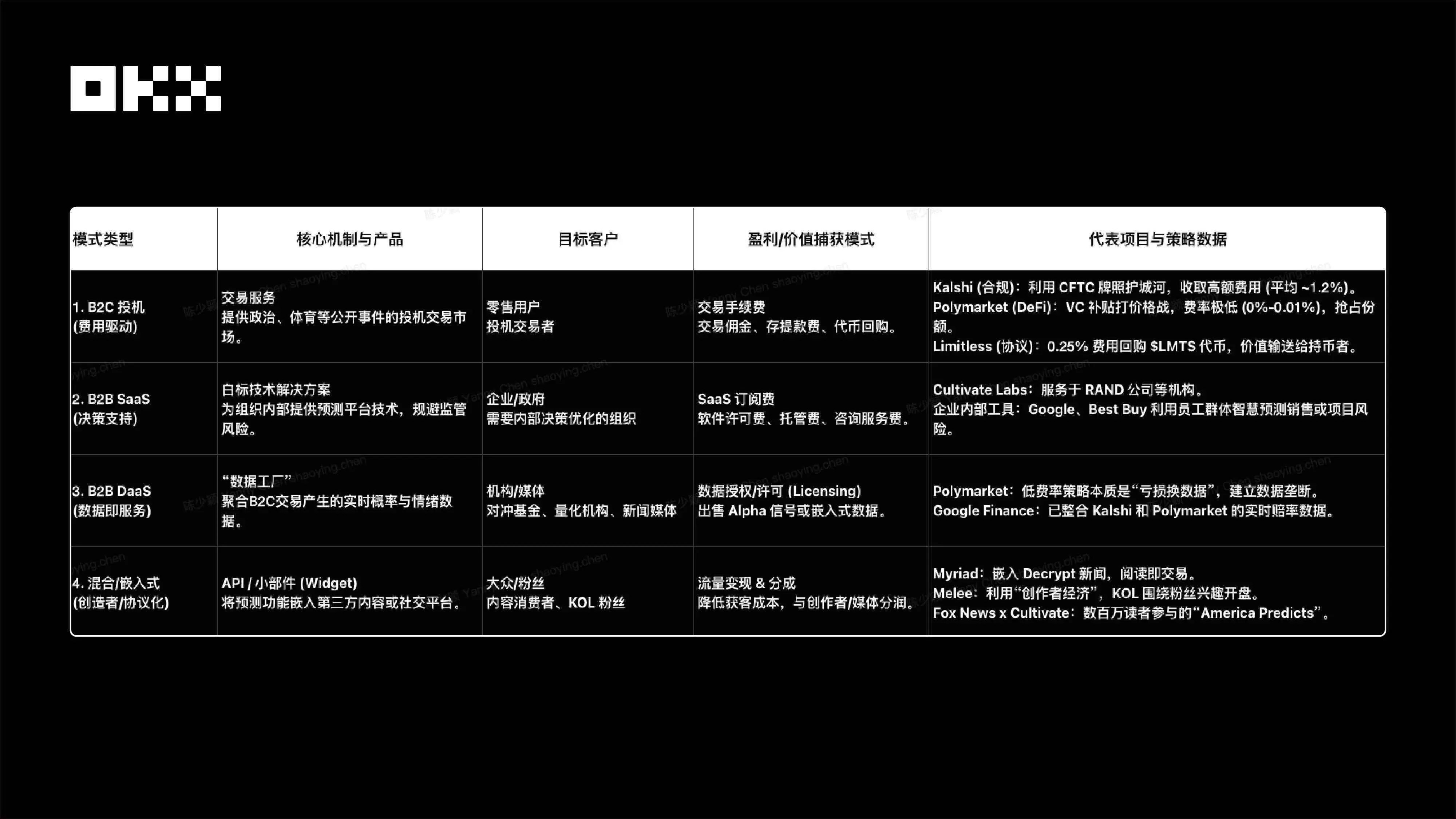 预测市场正从单纯的B2C交易手续费变现,向挖掘数据价值的B2B DaaS模式演进,并最终迈向嵌入媒体与创作者生态的混合模式以极小化获客成本。