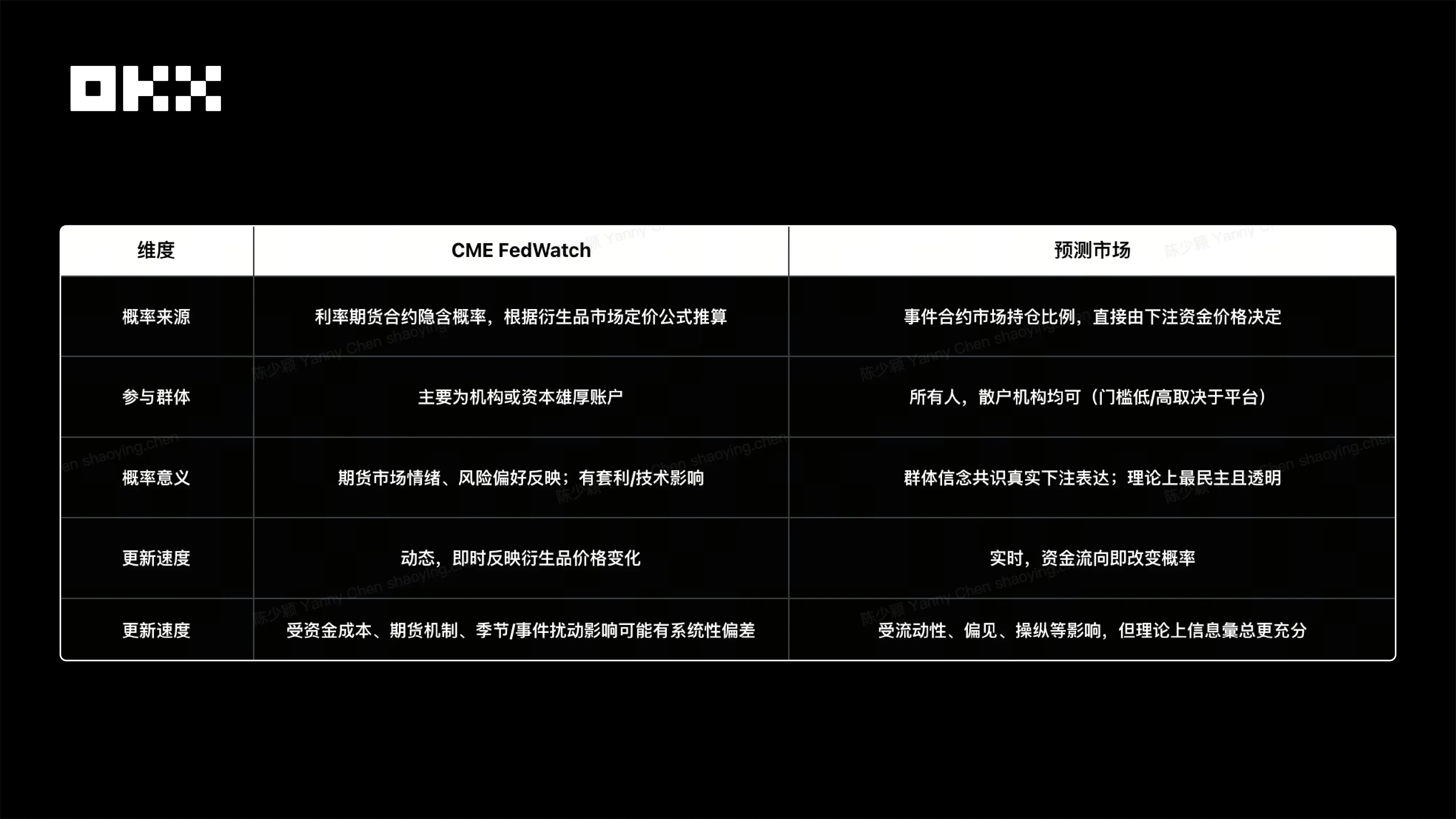 CME FedWatch等工具以衍生品价格反推出概率,代表机构预期,但受工具设计和资金结构等影响。相比之下,Polymarket、Kalshi等开放型预测市场,由所有参与者下注直接决定概率,理论上更透明和民主,平台活跃度越高,反映的信息越充分。