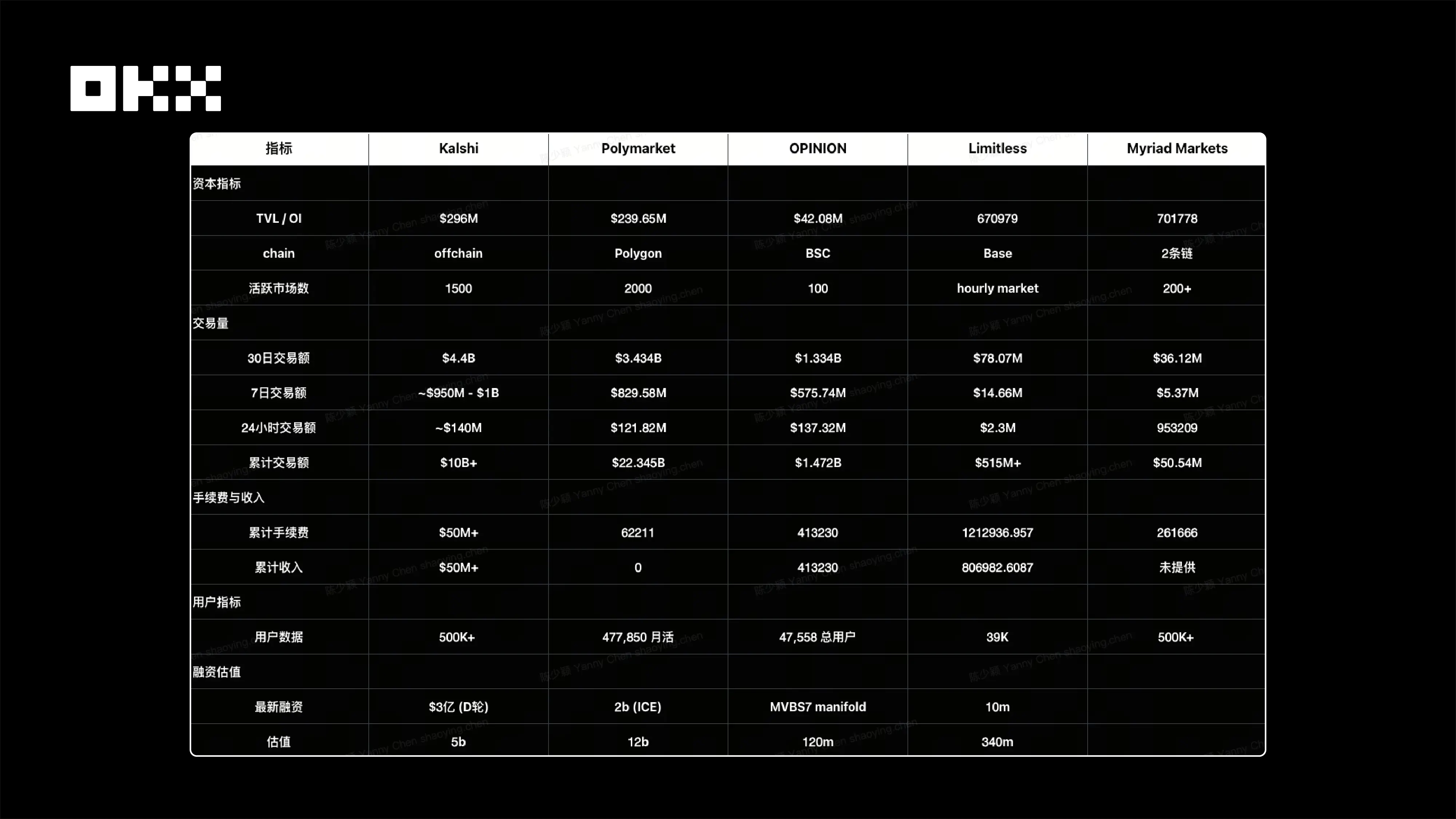 除了两大巨头,Opinion Lab、Myriad 和 Limitless 等平台在特定激励或垂直场景下也产出了值得关注的数据。