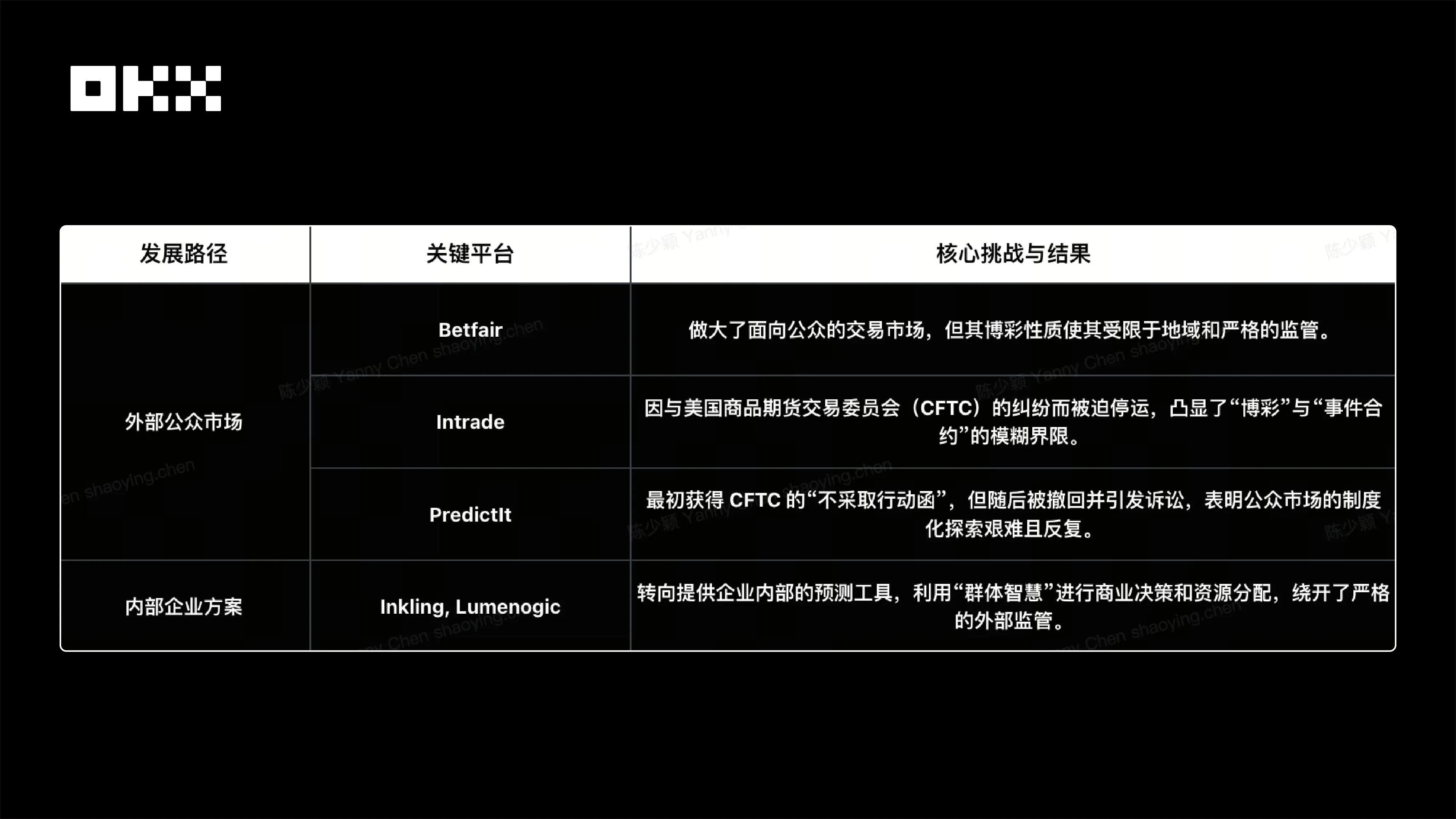 2000年代起,预测市场商业化浪潮兴起,但受到博彩/金融监管的多重挑战。代表性平台如Betfair、Intrade迅速壮大,但也因博彩属性、合规难度而受限甚至停运。PredictIt尽管初获“不采取行动函”,后续仍被撤回并陷入诉讼,凸显外部合规市场制度化难度极高。相比之下,Inkling等企业内部预测市场则避开监管,成为企业决策辅助的重要工具。