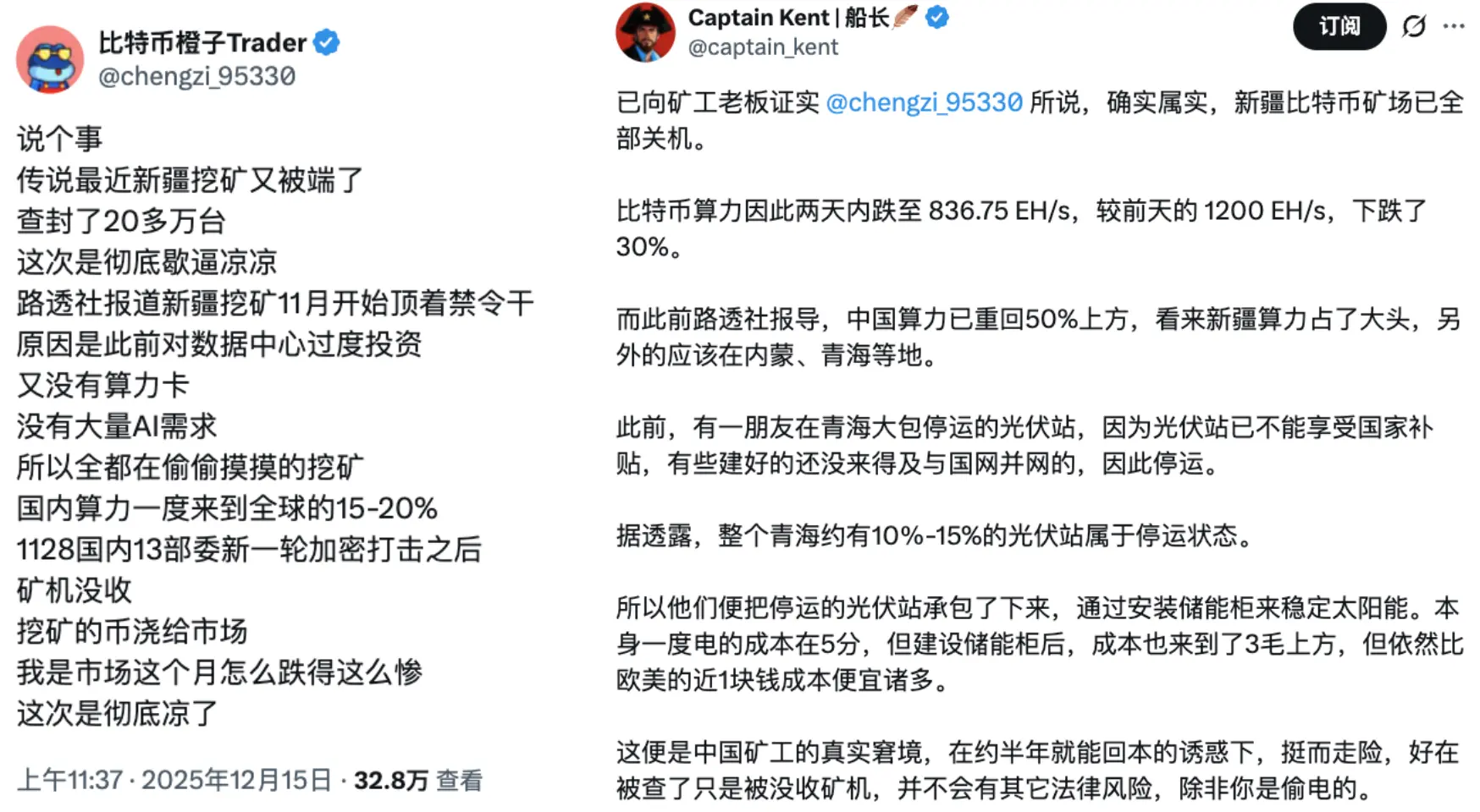 这些数据,也符合当前「新疆比特币矿场在陆续关机」的传闻背景。现 Nano Labs 创始人及董事长孔剑平也表示比特币近期算力下跌情况,按照(每台机器)平均 250T(算力计算),近期至少 40 万台比特币矿机关机。