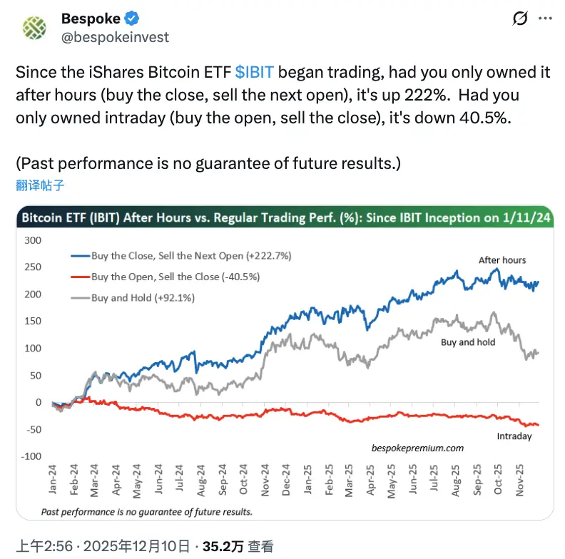 比如非常有意思的一点是,比特币在美国交易时段的表现相对更疲软。Bespoke Investment 统计的数据表示:「自贝莱德 IBIT 比特币 ETF 开始交易以来,若在收盘后时段持有,收益达 222%,但若仅持有盘中时段,则亏损 40.5%。」