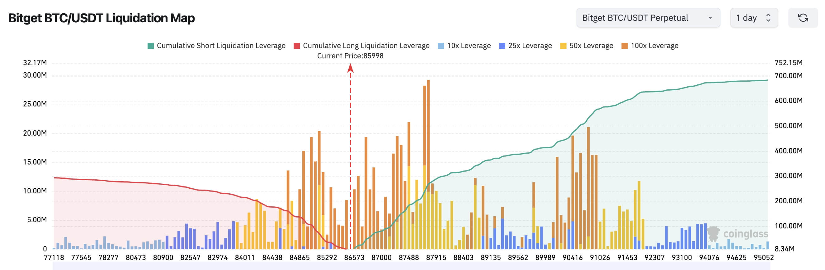 3、Bitget BTC/USDT清算地图显示:当前BTC价位约在 85,998 附近,下方 85k 一带多头清算已基本释放,而上方 87k–92k 区间空头清算杠杆快速累积,存在明显“逼空”空间。若价格向上突破并站稳 87k,可能触发连续空头清算推动加速上涨;反之跌回 85k 下方,短期动能将明显转弱。