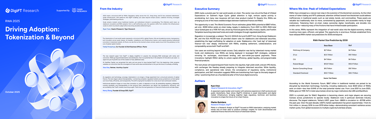 本报告由DigiFT与Tiger Research联合撰写,全面解析RWA生态体系:构建者与使用者全景图,以及代币化股票与债券如何逐步吞噬传统金融。