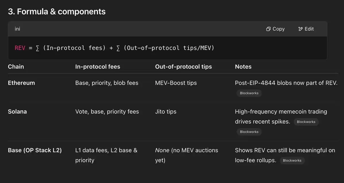 「REV 包含协议内的交易手续费和协议外用户为交易执行支付的小费,因此它衡量了链上交易的整体货币需求。」—@blockworksres