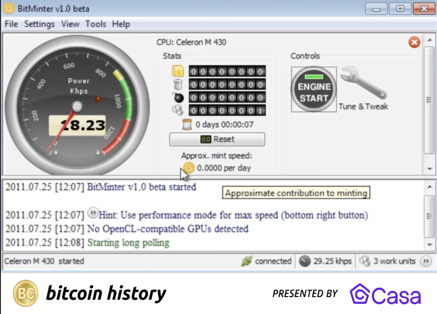 比特币在价值10美元时挖矿的情况如下图,Allinvain仍可使用家用电脑。他按下按钮就生成BTC。