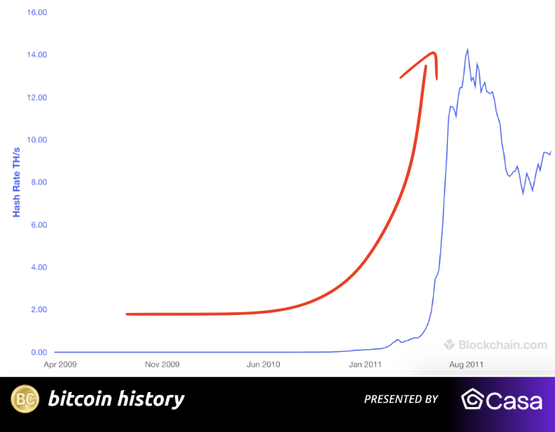 到2011年,挖矿难度飙升。哈希率飙升至4 TH/S。而2010年,哈希率仅为这一数字的0.001%——增长了114,000%。