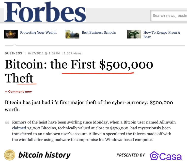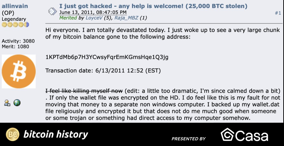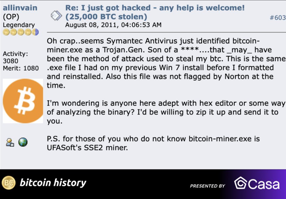 比特币第一起盗窃案:一位加密OG因秘钥泄露被盗2.5万枚比特币