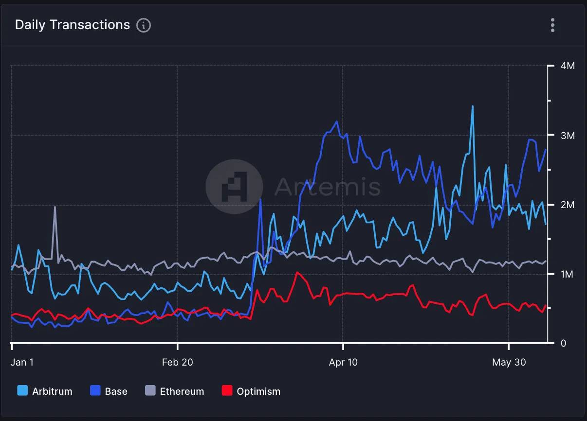 自从 Dencun 升级以来,Arbitrum 和 Base 的日交易量已经超过了以太坊主网,并且这一趋势持续未变。虽然以太坊的扩展仍有很多工作要做,但这是朝着正确方向迈出的重要一步,基础设施自上一个周期以来显著改善。最近几个月,Arbitrum 和 Base 链上的活动和交易量增加,可能只是本周期将要到来的冰山一角。