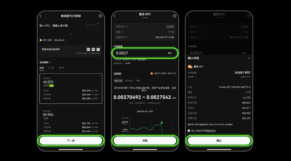 2)以看涨BTC为例,根据不同参考年化及期限选择心仪产品,点击【下一步】进入申购页面。输入【申购数量】,点击【申购】,完成【确认】即可申购成功