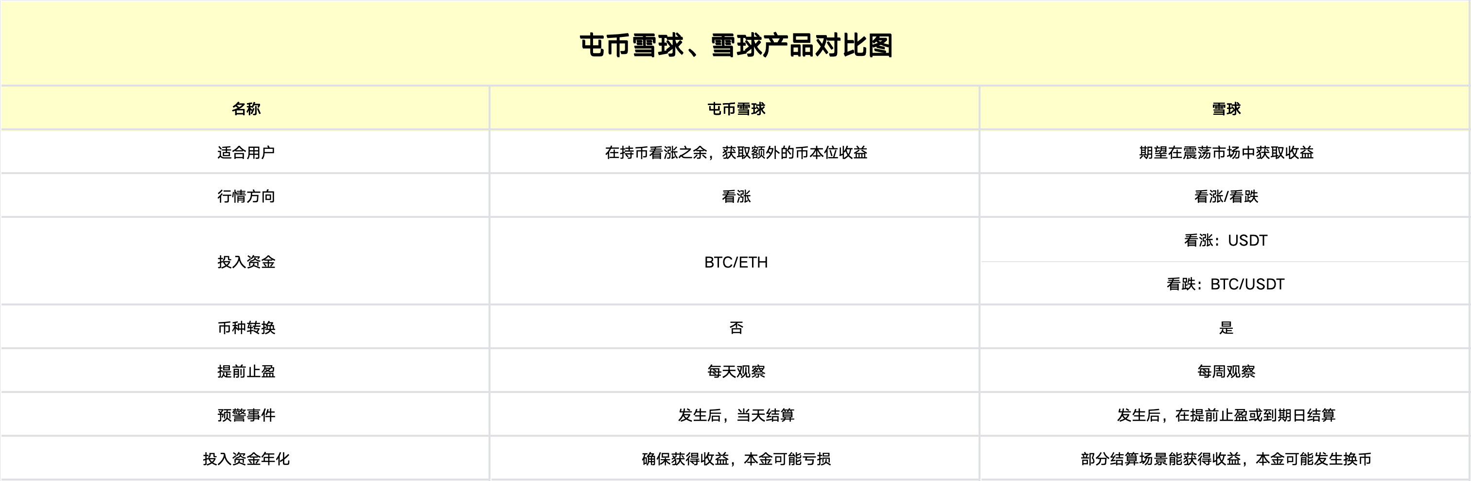 相比于OKX屯币雪球而言,OKX原版雪球产品提供看跌选项,且年化更高,但用户的本金可能会转换为稳定币。