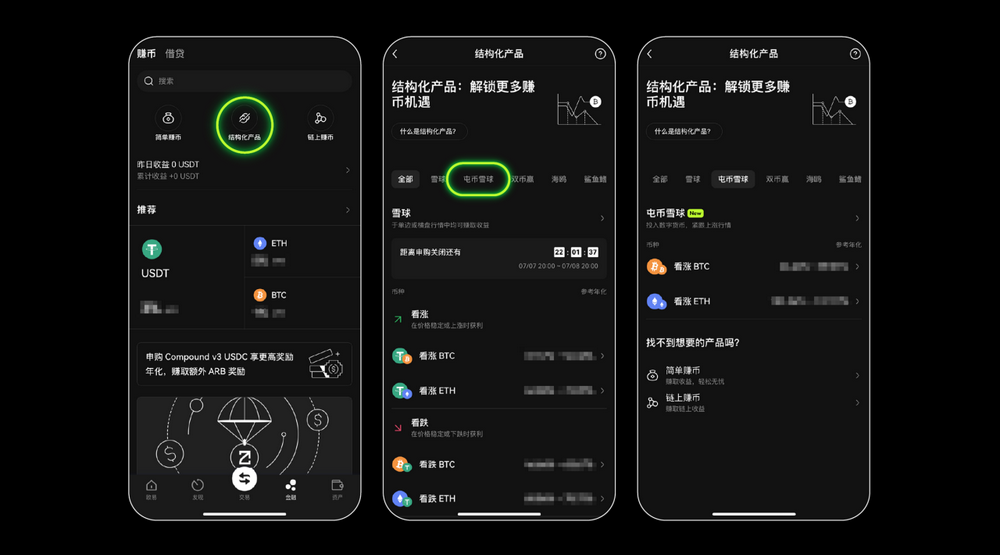 1)打开OKX App,选择【金融】-【赚币】-【结构化产品】-【屯币雪球】