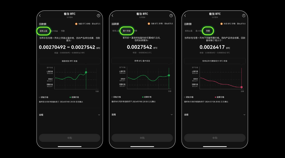 用户只需要投入本金,零额外费用。此外,还可以自定义申购期限、申购金额、申购标的等等。其中, 看涨BTC产品起投数量低至0.0004BTC,看涨ETH产品起投数量低至0.005ETH,参与门槛非常低,对广大用户非常友好。此外,OKX 屯币雪球可以实现提前止盈、最大收益和预警三种可能的收益场景。