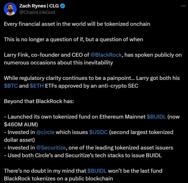 Zack Ryne(@ChainLinkGod)的观点突显了这一点,他指出世界上每一种金融资产最终都将在链上被代币化。「代币化世界」的口号在加密周期中一直很流行。他断言,这不再是一个「是否」的问题,而是「何时」的问题。尽管监管透明度仍然是一个挑战,BlackRock 的联合创始人兼 CEO Larry Fink 公开谈到了这种必然性。虽然 SEC 一向对加密货币持反对态度,Larry 的比特币和以太坊 ETF 成功获得了 SEC 批准。