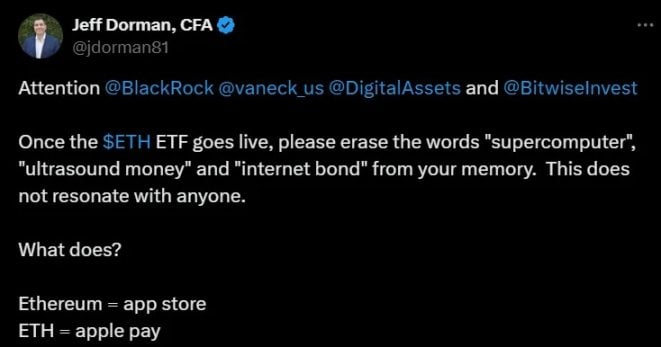 David:好的,现在我们来谈谈第二个叙述:Ethereum 是一个应用商店(app store)。这个理念来自 Jeff Dorman,他在推文中写道:「注意 BlackRock、VanEck、Digital Assets 和 Bitwise:一旦 ETH ETF 上市,请删除 「超级计算机」、「超稳健货币」 和 「互联网债券」 这些词汇。这些词汇对任何人都没有共鸣。什么叙事才有共鸣呢?那就是 Ethereum 是一个应用商店。」这种角度吸引了许多人,因为对于那些没有加密背景、不知道 Ethereum 是什么的人来说,也会对这个概念非常熟悉。