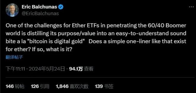 David:今天这档节目实际上源于 Eric Balchunas 的一条推文,他指出了以太坊 ETF 面临的一个挑战:将以太坊的愿景和价值提炼成类似于「比特币是数字黄金」这样易于理解的口号,来渗透 60 岁以上的前婴儿潮一代的世界。以太坊有简单的宣传口号吗?如果有,那是什么?比特币是数字黄金。比特币的美在于其简单性,一行简洁的口号就能描述清楚,而以太坊的涉及的范围太广,我认为则要至少 60 秒才能说清楚。因此,我们今天在节目的最后为以太坊 ETF 的推广话术的时间设定为 60 秒。