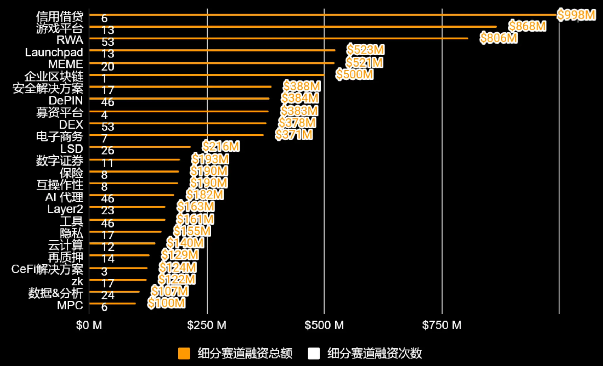 - DeFi:61.9亿美元(281笔, 平均单笔2200万美元) 稳定但增长放缓, 介于CeFi和基础设施之间