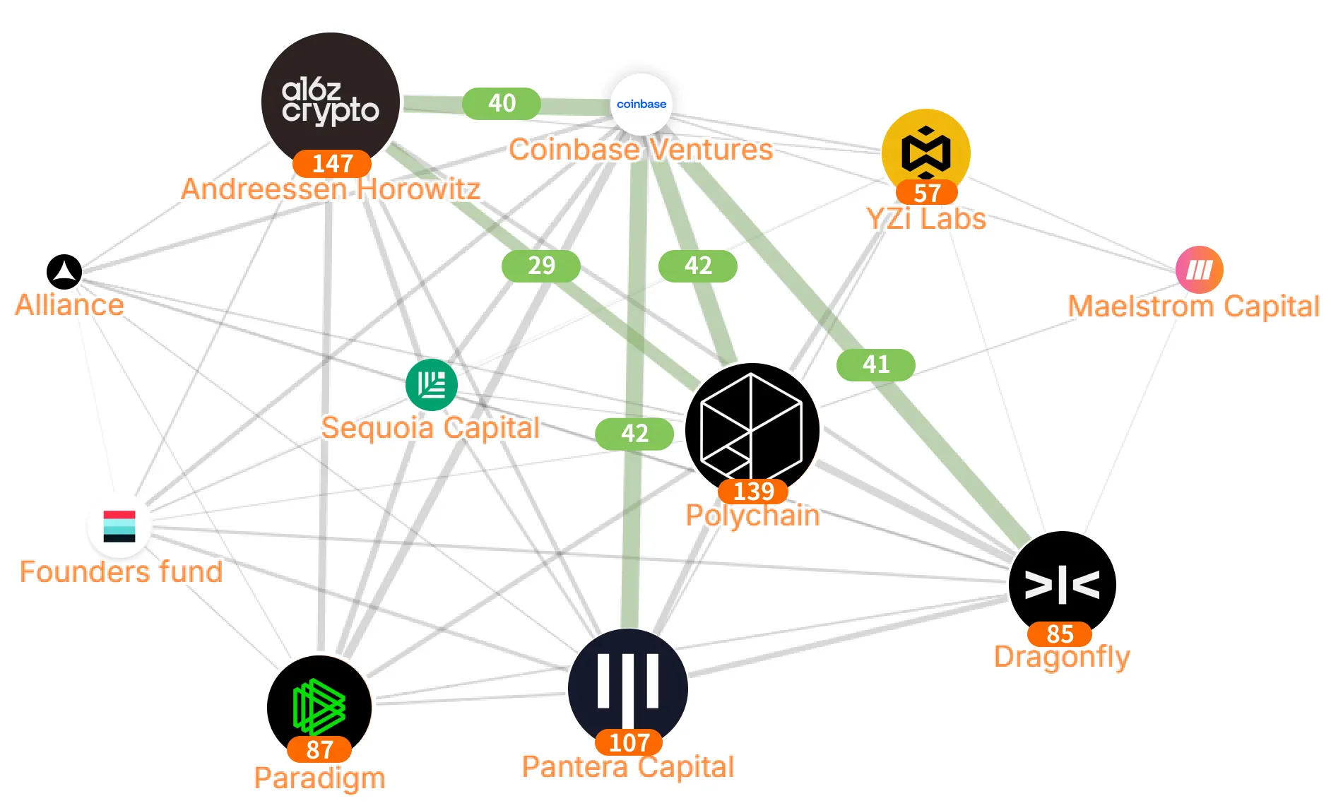 - 核心集群形成:Polychain、Coinbase Ventures、a16z、Dragonfly、Pantera构成紧密网络,常多方联合。少数巨头主导流量,中小VC(如YZi Labs、Founders Fund)通过联合进入优质deal。