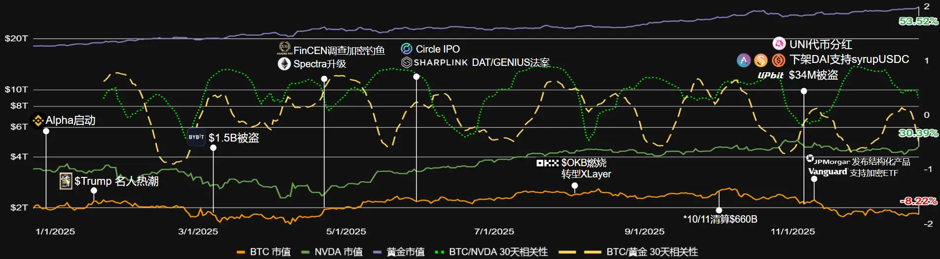 年初,特朗普就职引发短暂乐观,$TRUMP等名人meme币推出,驱动社交热点与娱乐化浪潮,但也加剧资产泡沫化。DAT概念兴起,成为企业比特币财库管理典范(如MicroStrategy持仓超3%供应)。“1011暴跌”将币圈存量问题无限放大,杠杆清算超190亿美元,比特币从12.6万美元峰值跌至约9万美元低点,并受关税等宏观冲击影响。