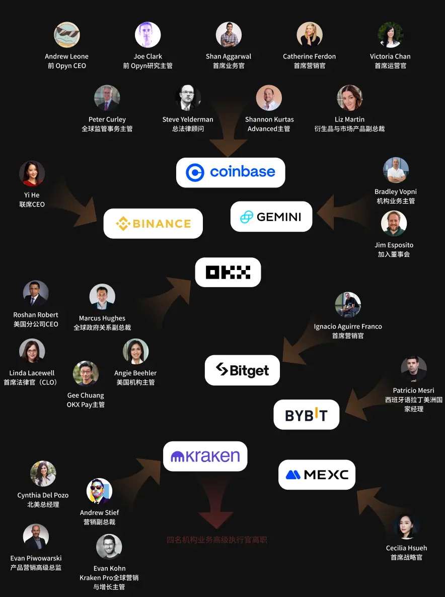 - 营销、产品与运营优化:营销相关变动频发, 如 Coinbase、Kraken 和 Bitget 分别任命首席营销官或营销副总裁, 旨在提升品牌曝光和用户增长。内部晋升和收购(如Coinbase 通过 Opyn 收购引入人才)也常见,反映运营效率提升。Kraken 的机构执行官离职伴随裁员,则指向成本控制和 IPO 准备(计划2026年)。