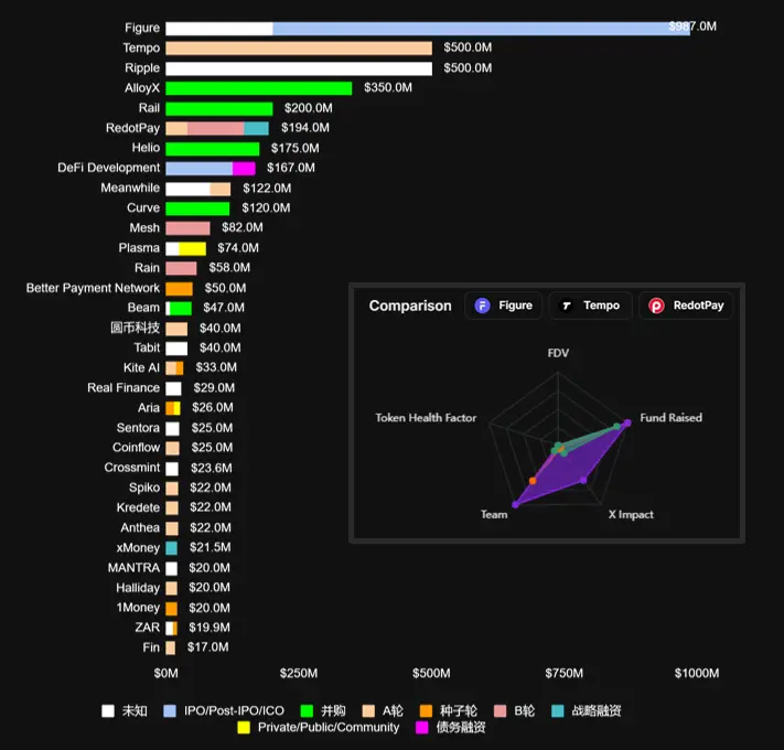 根据Rootdata对比功能显示,支付/RWA赛道呈现TradFi与Crypto深度融合趋势, 头部前3获得融资的除了Ripple外分别为: