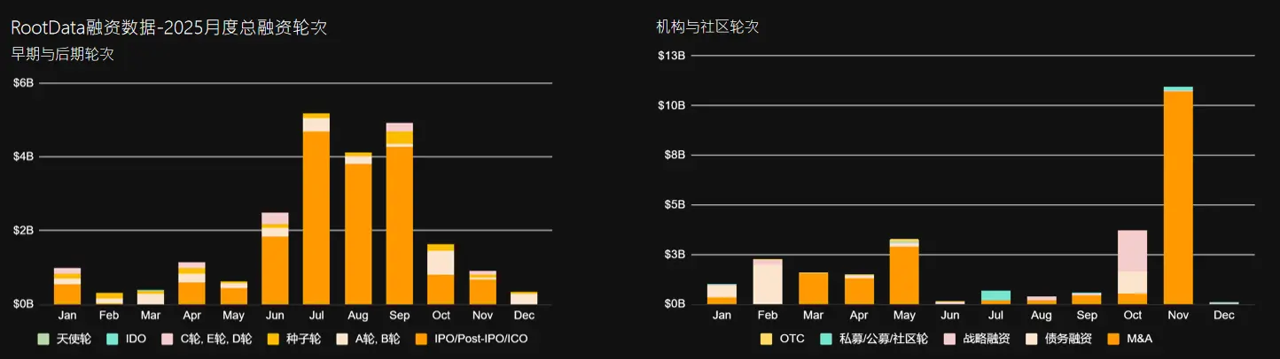 从月度时间线上看看, 2025年呈现"IPO集中Q3、并购爆发Q4"的明显节奏分化, 反映加密企业"先上市融资、后整合扩张"的战略路径: