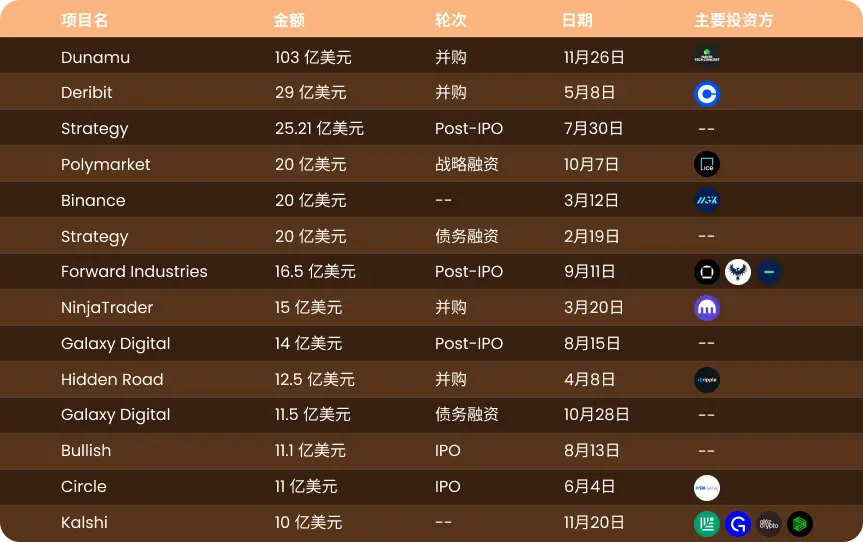 综合来看, 融资金额虽创近三年新高, 但这一增长并不意味着市场全面复苏。全年融资规模的抬升, 主要由 Polymarket、Binance 等少数头部项目的超大额融资所驱动, 资本高度集中于确定性强、规模化程度高的项目。