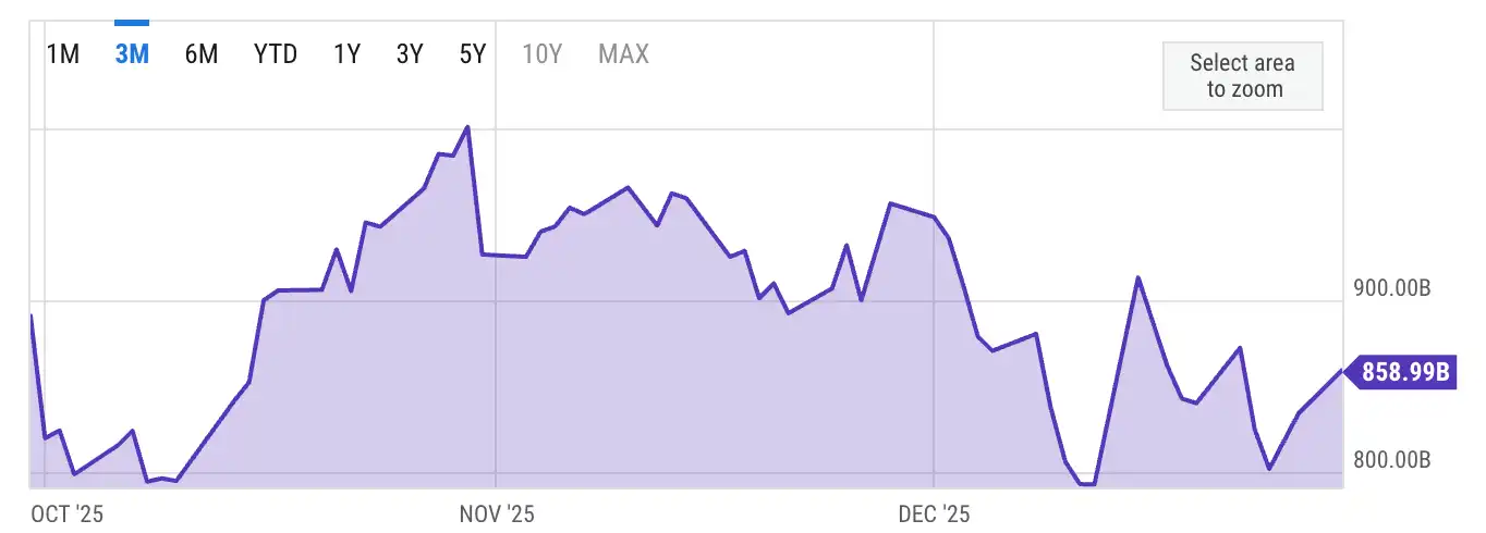 距离美国政府开门已经过去了一个半月的时间,目前 TGA 的余额大约是 8500 亿美元。也就是说已经释放了 1000 亿美元的支出,为市场提供了不少流动性。