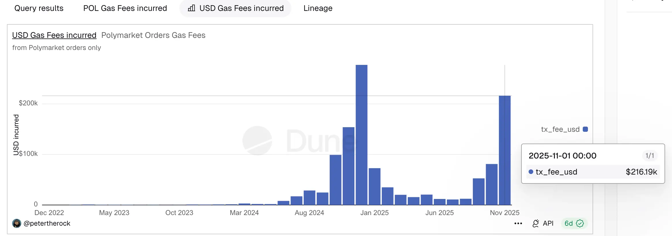 · 考虑到该数据偏久,我们又检查了近期的变化情况,数据分析师 petertherock 于 Dune 绘制的统计显示 11 月 Polymarket 相关的交易合计消耗了约 21.6 万美元的 gas,而 Token Terminal 则统计显示当月 Polygon 全网 gas 总消耗量约为 93.9 万美元,比例同样接近四分之一(约 23%)。