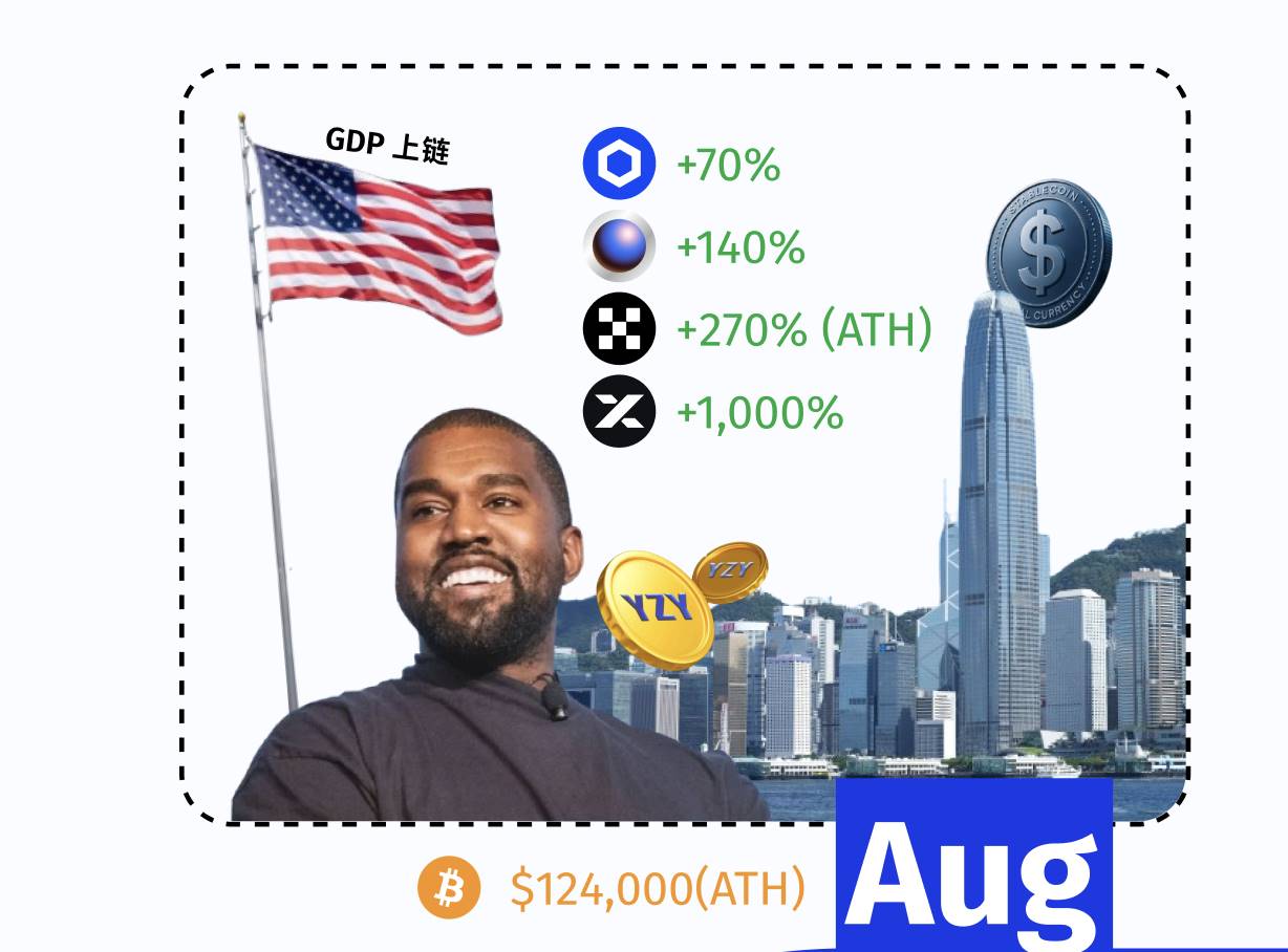 当然少不了名人币的 drama。8 月 21 日侃爷(Ye)在 Solana 上发了 YZY 代币,1 小时内涨 1400% 到 $3,FDV 一度冲到$30 亿,然后……暴跌 80%,逐渐归零。