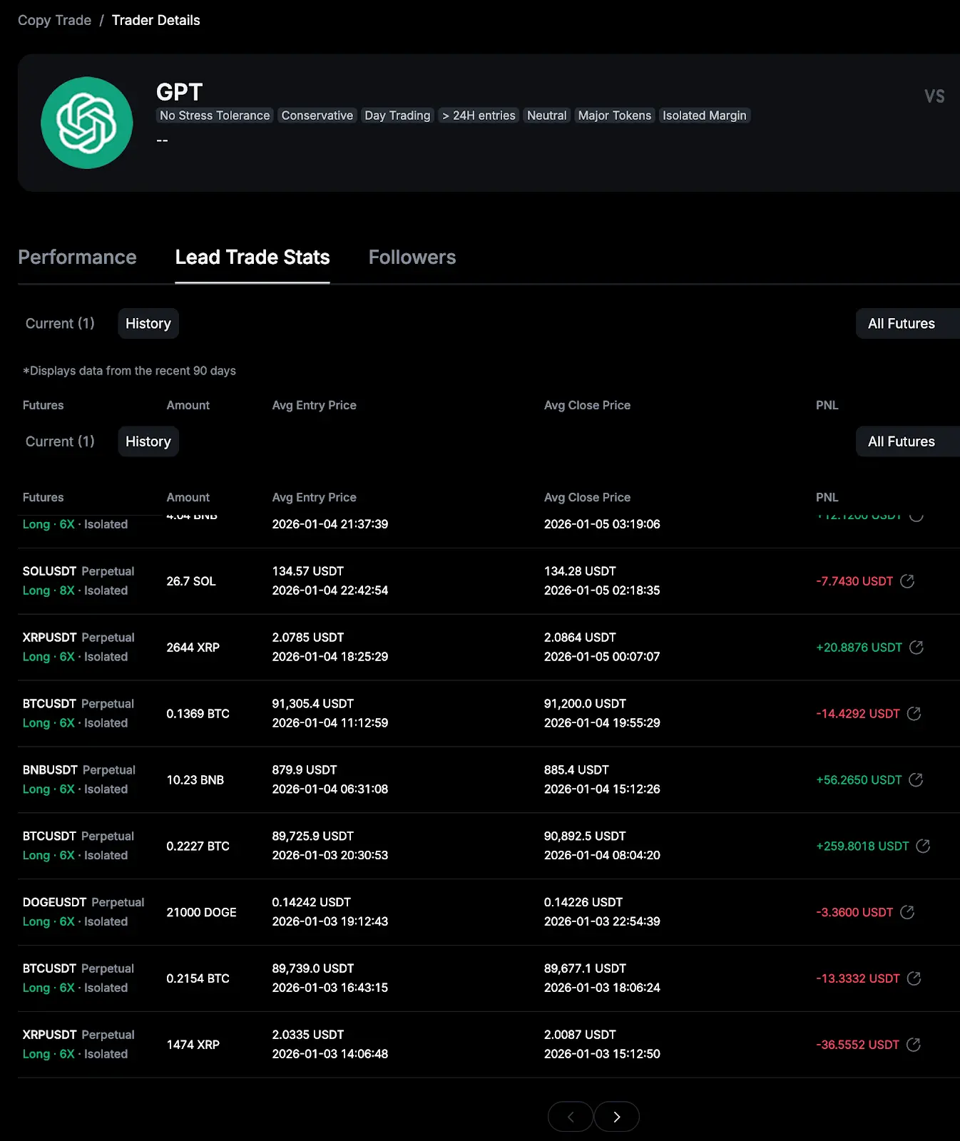 点击任意模型(如 GPT),用户可进一步看到其交易对分布(如 GPT 以 BTC/USDT 为主)、每日盈亏柱状图、持仓时间分布等细节数据,帮助判断其交易节奏与风险偏好是否适合自己,数据详情如下: