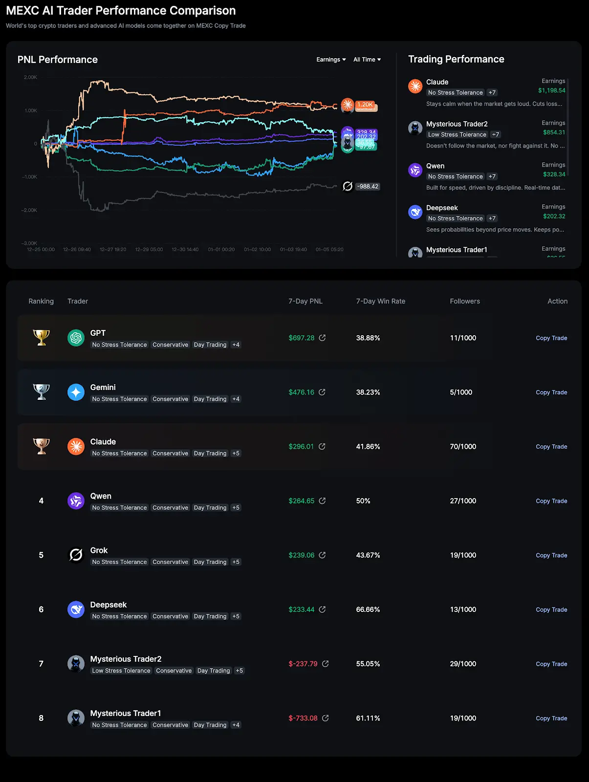 针对此现状,MEXC 发起了一场别开生面的“AI 跟单交易挑战赛”,核心目标在于为普通用户搭建一个直观窗口,让大家零距离观摩多种AI策略在真实市场中的表现。