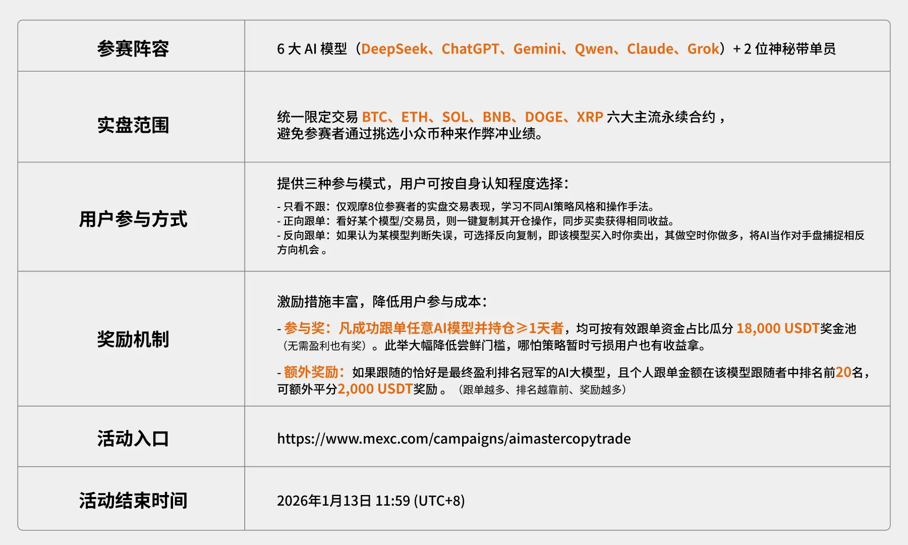 随着大模型技术的快速发展,AI 交易正在完成从"概念炒作"到"实用工具"的转变。普通交易者可以看到大模型如何分析行情、如何控制风险、如何调整策略,从中找到适合自己的风格,并逐步建立独立的交易体系。这或许才是 AI 跟单竞赛的核心价值,并非单纯的“无脑”跟单,而是赋能更多人借助 AI 提升交易能力,成为更成熟的投资者。目前MEXC AI跟单大赛正在火热进行中,比赛将持续至1月13日。这不仅是一次瓜分20,000 USDT奖池的机会,更是一次打磨交易策略、提升交易能力的宝贵机会。当 AI 成为交易的基础配备,交易者之间的竞争在于如何与AI协同作战,理解其逻辑、筛选其策略、组合其优势,让AI为你所用。