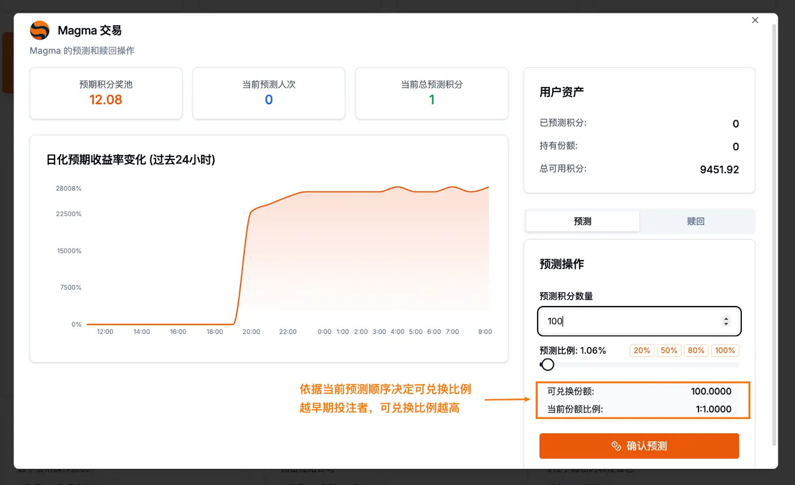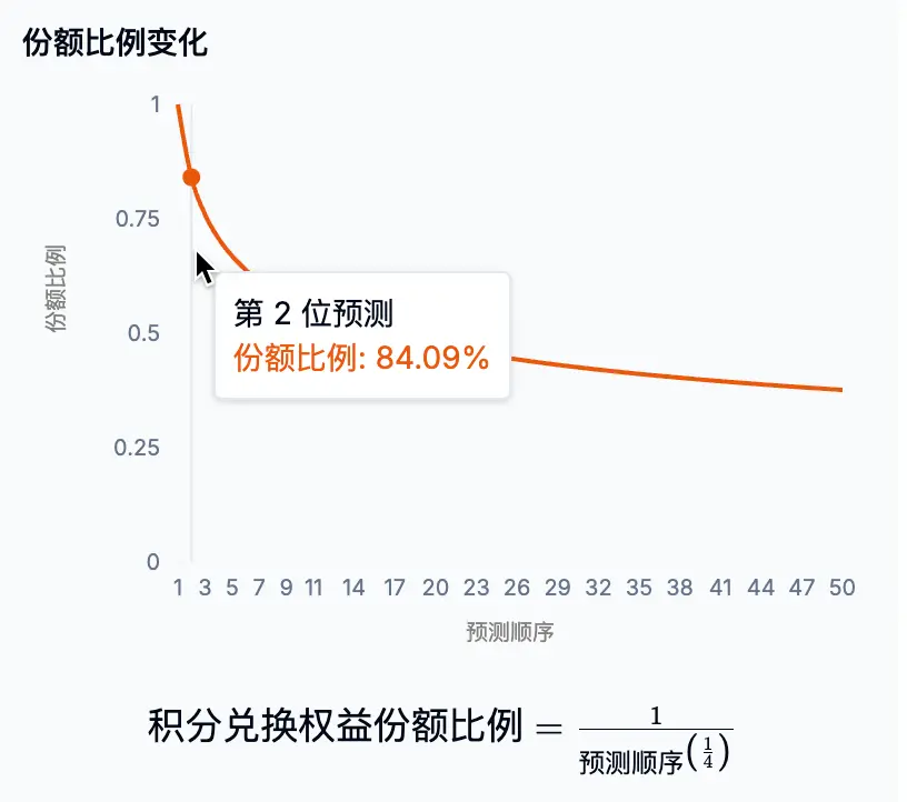 2、早鸟激励机制:越早押注,兑换比例越高。例如,第一位押注项目A的用户,可用100积分兑换100份额;而第二位押注者,同样100积分只能兑换84.09份额。这鼓励早期发现价值,也模拟了真实市场中“早鸟优势”。