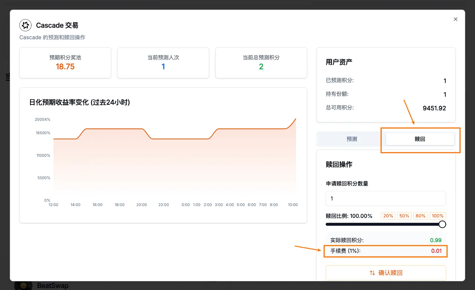 5、随时赎回:你可以随时发起“赎回”,将持有的权益份额换回积分,每次赎回收取1%手续费。