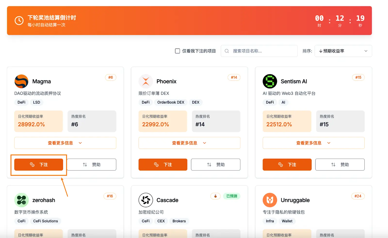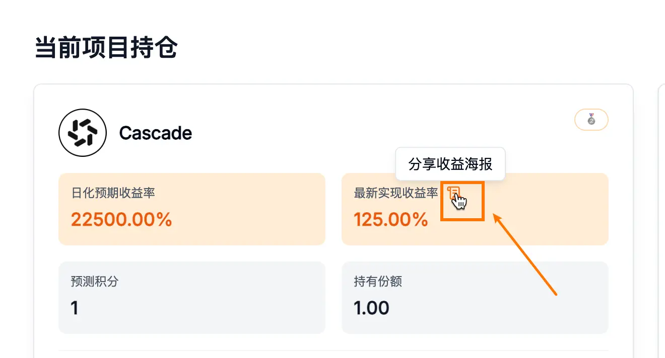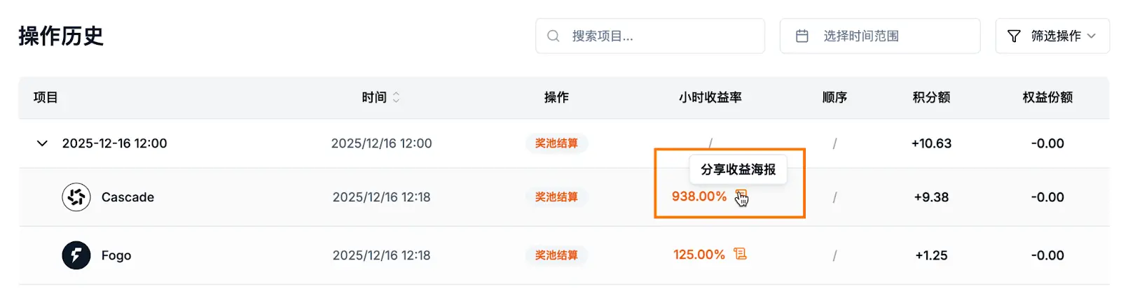 3、积分奖励:系统每小时都会为位列热度榜前50名的项目发放一笔积分奖励,形成一个“奖池”。如果你押注的项目成功上榜,你就能根据自己持有该项目的“权益份额”占比,从奖池中分得相应比例的积分。这就像你提前看好并投资了一支潜力股,每当它成绩好(排名高),你作为“股东”就能立刻获得分红。