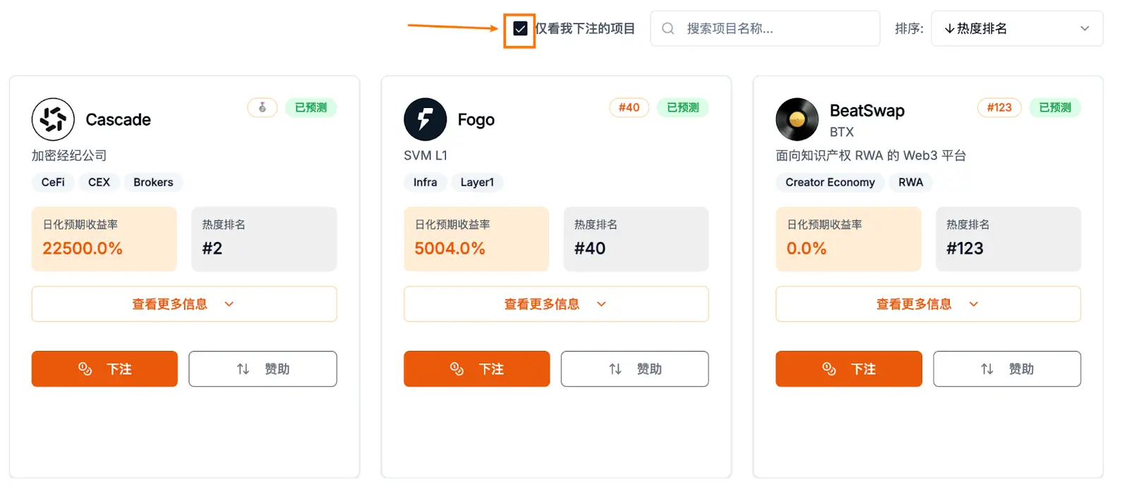 1、参与方式:登录系统后每人获得 100 初始积分,用于押注你看好的项目。押注后积分将按比例兑换为对应项目的权益份额。权益份额也可以赎回为积分。