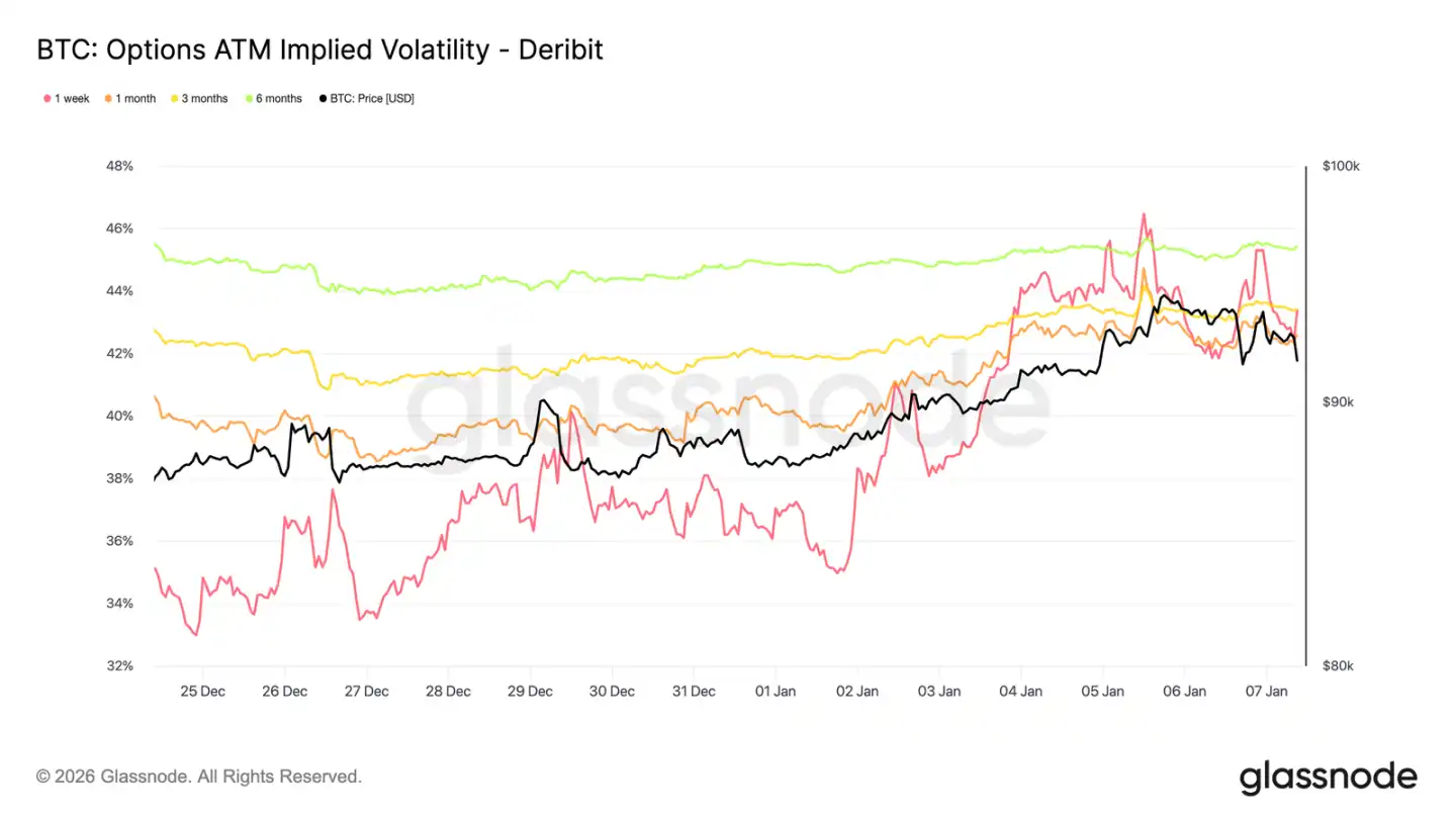 尽管有所回升,但隐含波动率仍处于压缩状态。从一周到六个月的各期限波动率集中在 42.6% 至 45.4% 之间,曲线形态相对平坦。