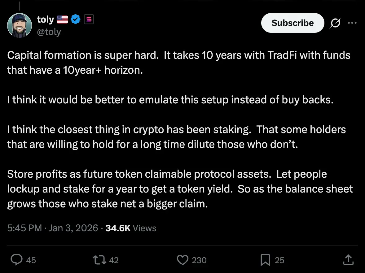 Solana 创始人 Anatoly 认为,项目不该追求短期的价格刺激(回购),而应该学习传统金融,建立一个长达 10 年的资本积累过程。他更看好质押机制,让愿意长期锁定的持有者获得更多份额,借此稀释短期投机者。他认为应该将利润储存为“未来代币索取权”,而非消耗在市场波动中。