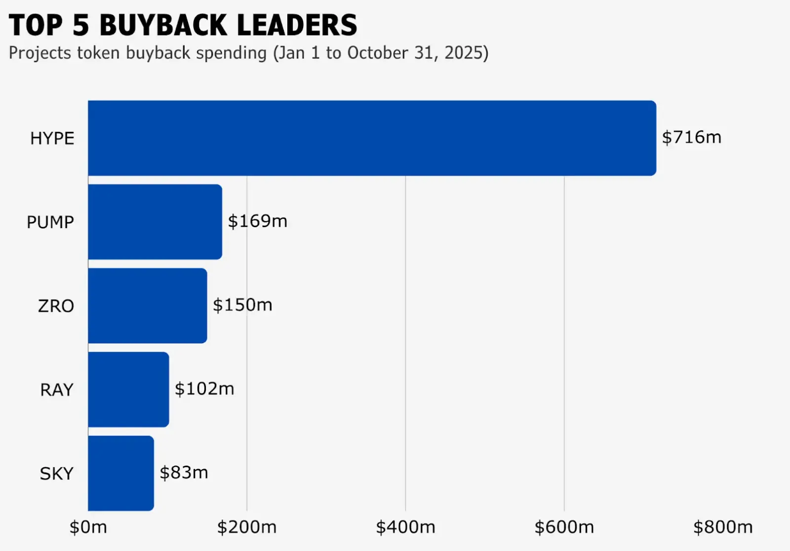 根据市场研究机构 blockmates 对 2025 年 1 月至 10 月回购项目的追踪,排名前五的项目分别为 Hyperliquid、Pump.fun、LayerZero、Raydium 以及 Sky。其中 Hyperliquid 回购金额高达 7.16 亿美元,而位居末席的 Sky 也投入了 8,300 万美元。