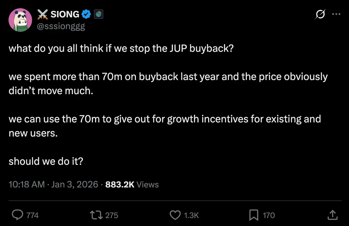 近期 Jupiter 联创 SIONG 在 X 上发起讨论,提议停止 $JUP 代币的回购计划。他表示 Jupiter 在过去一年投入了超过 7,000 万美元进行代币回购,但币价表现却乏善可陈;同时,Helium 创始人 Amir Haleem 则直接宣布停止代币回购,并将其形容为“把钱丢入黑洞”。