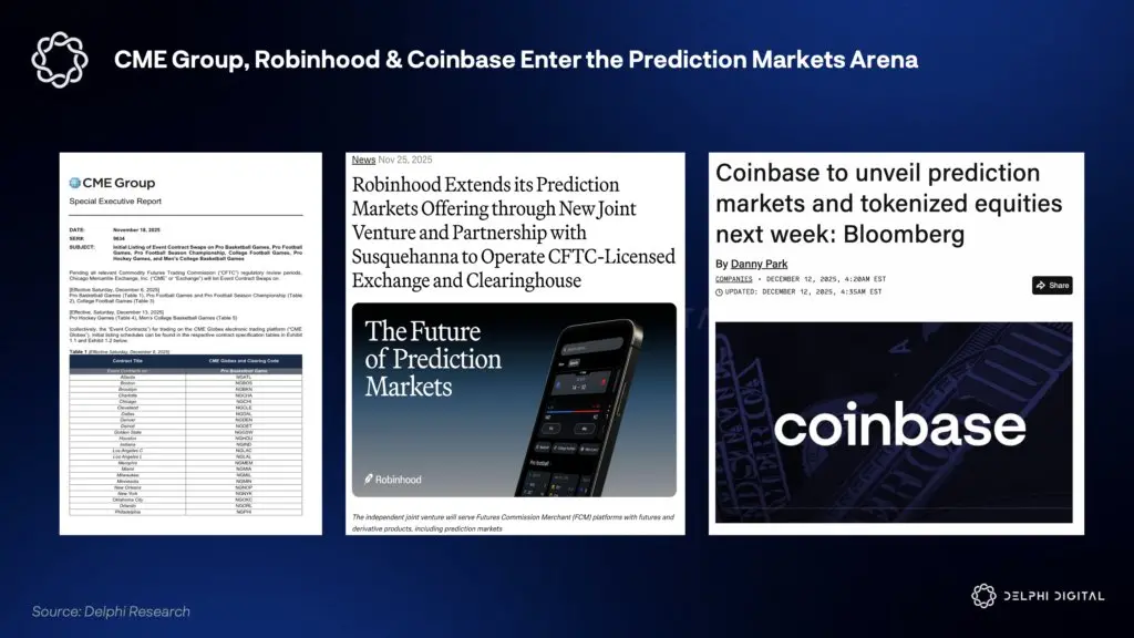 Delphi Digital:预测市场的三大趋势编译:Ken,Chaincatcher预测市场已从一个小众领域跃升为一个规模超过 6 亿美元的赛道。下一阶段的发展趋势是什么? 巨头们正陆续入场:芝加哥商品交易所集团计划推出体育类市场,Coinbas